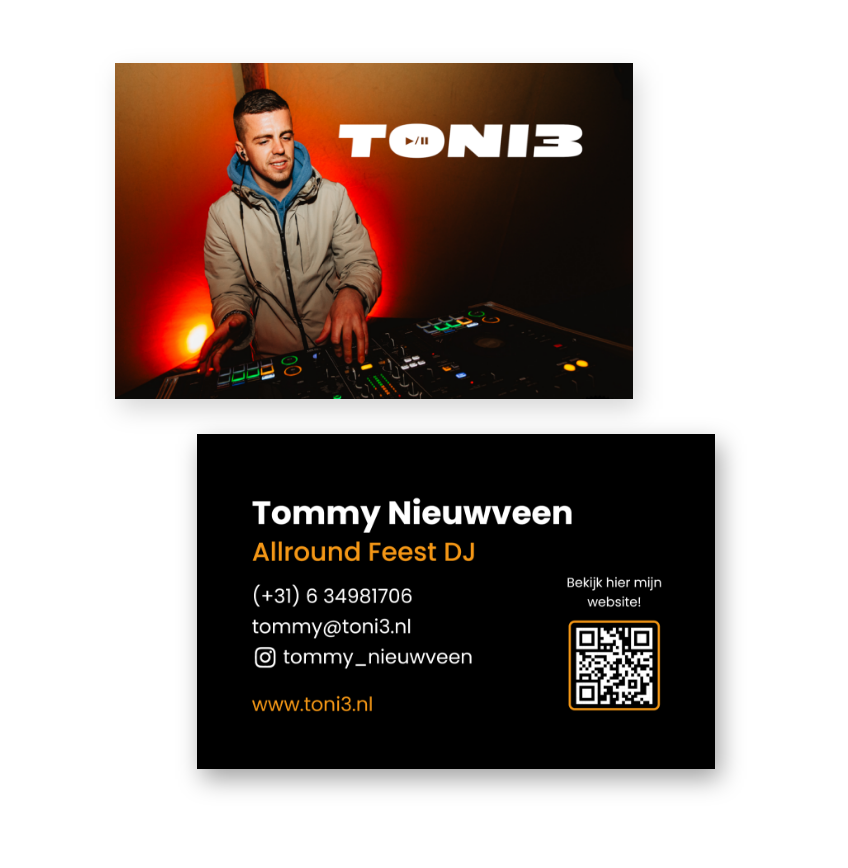 Om snel contactgegevens uit te wisselen bij feesten en evenementen heb ik voor TONI3 visitekaartjes gemaakt. TONI3 heeft zijn visitekaartjes niet alleen aan potentiële klanten gegeven, maar ook aan vrienden. Zodat zij op grote evenementen deze kaartjes kunnen achterlaten en zo reclame voor TONI3 kunnen maken.