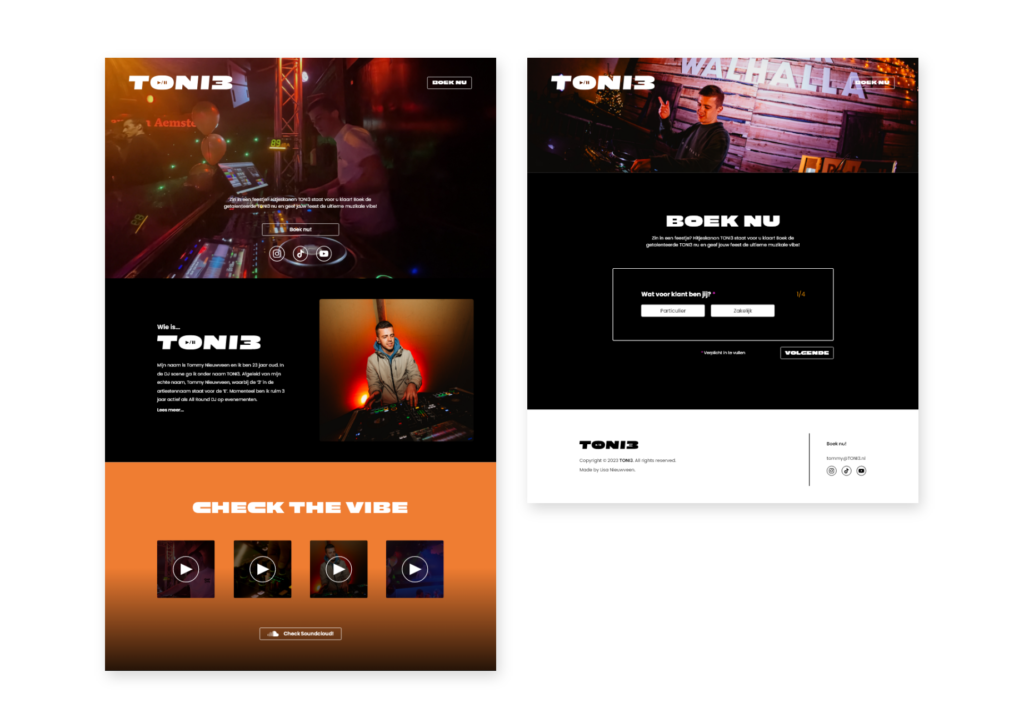 TONI3 had een paar eisen voor de website, een homepagina met alles erop en eraan. En een manier voor potentiële klanten om gemakkelijk te boeken. Daarom hebben we dit opgedeeld in twee pagina’s, home en boek nu. De homepagina bevat alles wat de gebruiker wilt weten, een stukje over TONI3, een voorproefje van de muziek en ook niet onbelangrijk een agenda met gigs die al ingepland staan.