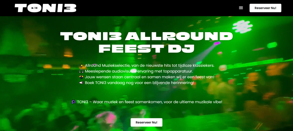 TONI3 is een jonge ondernemer, pas geleden begonnen met zijn Allround DJ business. Om informatie over zijn diensten online aan te bieden wilde hij graag een eigen website. Daarom mocht ik de branding en website voor TONI3 ontwerpen en realiseren.